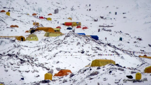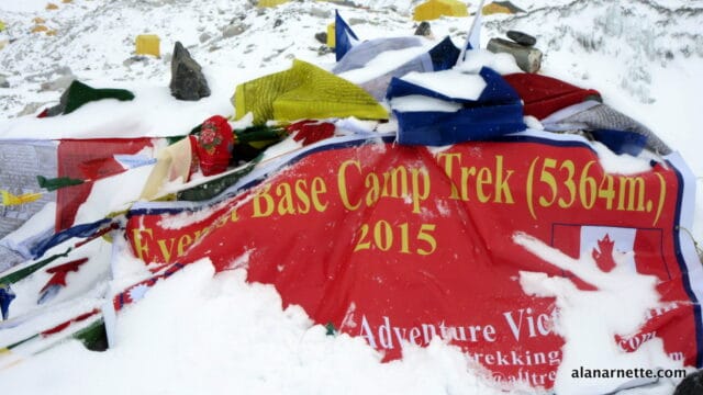 Another step and a left turn, then right. There is a rock wall blocking our path to this camp – how unfriendly! Yet soon you will understand its not for humans but for wandering yaks, You search for your camp. They all look alike. And random names on the banners that lack originality. There is Nepal Adventures, Nepal Treks, Nepal Climbing, Everest Summits, Everest Climbs, 8000 Meter Treks and more variations on the words: Everest, Treks, Adventure and … whatever you can associate with climbing. Sigh.