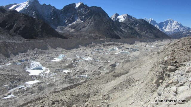 Oh my. Today we actually get to Everest Base Camp. It’s not far. Gorak Shep is 5,164-meters/16,942-feet and EBC is at 5,380-meters/17,600-feet, “Only” a gain of 440-meters/1,393-feet over 11.3 km/7 miles. From now on, distance is not measured in miles or kilometers but in time.