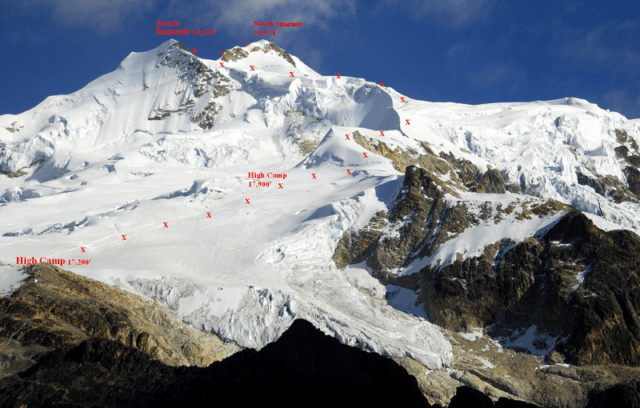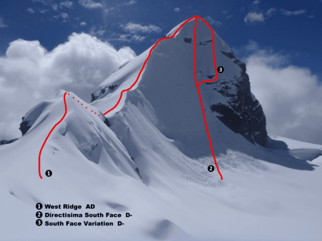 Located at the Condoriri Group in La Coordillera Blanca in Bolivia it stands at 17,749 ft / 5,410 m. The Pequeño Alpamayo, or Little Alpamayo is located at the Condoriri Group in La Coordillera Blanca in Bolivia. It is a pyramid of snow, with the standard route being about 55 degrees, snow, nice in the morning, but sticky later in the day. It was first climbed in August 1962 by South Africans Irene and Keith Whitelock. We will take the West Ridge route.