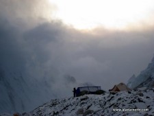 He went into action. I moved to the Sherpa cooking tent that while overlaided with the smell of propane, was warm. Kami frantically went through the medical kit looking for nausea medicine. Then he went on the radio to call Base Camp. Greg answered at 5:45AM. I told him what was going on in between coughs and we both agreed that descent without delay was the course. And with that, Kami and I packed, dressed in layers, roped up and headed down.