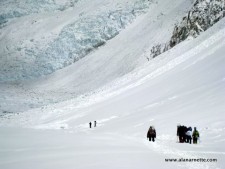 The lines, pickets, anchors had to be carried high and then the rock hard ice had to be chipped away or ice screws careful installed to hold the lines. Climbers are told never to put their full weight on the line since the anchors can melt out sending the unwary falling toward certain injury or even death. The lines are the difference between life and death. Staying clipped in is the key. I looked at the route and remembered the British climber who fell down the face, details unknown, in 2003. His body now rests in the Bergshrund at the base of the Face.