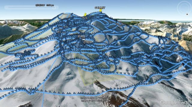 An exhaustive search has been underway the past few days including by aircraft with no success. It is reported today that the formal search has ended. Canadian Don Bowie, participated in the effort posted this image of GPS coordinates for one day of helicopter flight patterns over Mt. Elbrus plotted on Google Earth: