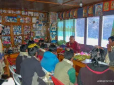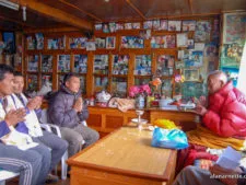If his daughter is home, she serves as organizer ushering people out, then the next team in. His wife brings in hot tea or coffee-milk along with simple biscuits on a metal tray. It is a large room by Sherpa standards with benches lined up against the walls. Lama Geshe sits behind a small desk, his back to a wall of windows allowing the sun to shine directly into the otherwise dark room. Usually, one of the senior Sherpas, often a monk himself, will take the lead and introduce the team and what mountain they are climbing. The Sherpas know Lama Geshe well as do many of the foreign guides and repeat visitors to the area.