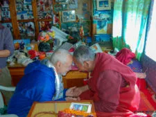 The puja begins with Lama Geshi quietly praying – a soft chant born hundreds of years earlier high on the Tibetan Steps. He uses a bird feather to wave at the smoke rising from a single piece of incense. He will spread water droplets from time to time and ring a bell. All of this has meanings deeply rooted in the Buddhist culture.