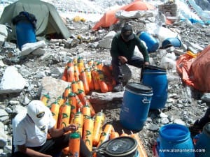 Next up will be another rotation to Camp 3 on the Lhotse Face around 23,500’/7162m and to the North Col on the Tibet side at 23,000’/7000m. Hopefully the ropes will get to the summit on both sides in the next ten days allowing for member summits starting around May 11. But for the 99% of climbers this season using supplemental oxygen, those bottles must be staged at Camp 4 on either side – and that takes a lot of work by the Sherpas.