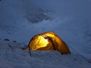 David Liano one of the 42 climbers there, has climbed to Camp 2 and is back at base where he reports: “A scene from base camp, just before we got dumped with 30cm of snow in 6 hours.” He leaves for C3 today. Don Bowie said he has gone up to 7,000 meters. Chris Burke made some interesting comments on her blog: