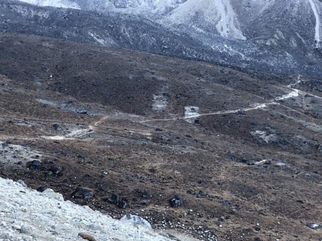 We took our first break on the Pass enjoying the views looking back and looking ahead. There were probably 30 people up there. At 17,782-feet, I felt the thin air. We left the Pass and stepped on snow for the first time, but only for about 15 minutes on the glacier. The route descending quickly along the glacier edge and onto a flat plain with an easy trail to Dzongla. By the way, all the teahouses were filled at Dzongla. Its busy in the Khumbu!