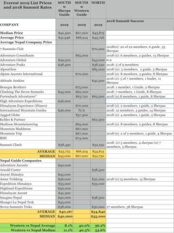 With all this as background, I used public websites and my own research to compile the 2019 Everest fees from the major Everest guide companies. I looked back at their 2018 summit rates and historical numbers where available using my own research, their websites and the Himalayan Database.