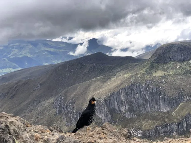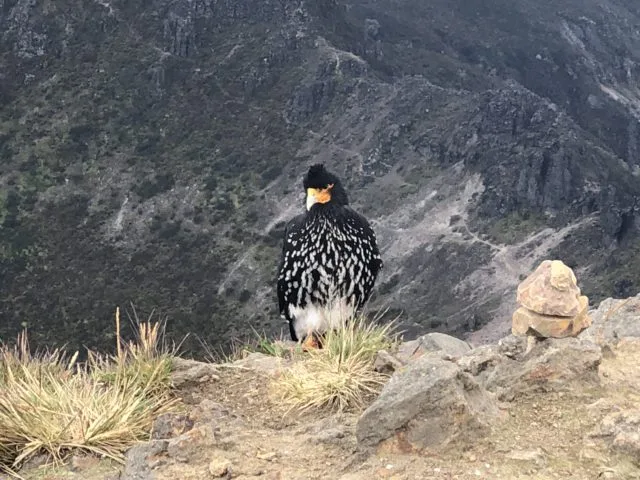 On the summit we were greeted by two Mountain Caracara birds who seem to originate in Panama but like to live in Ecuadoran Mountains above 14,000-feet. Like most mountain birds, they have figured out people mean food, but I saw no one feeding them.