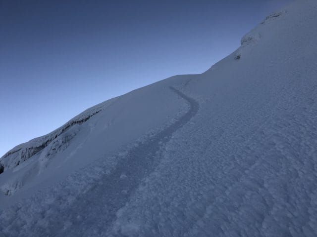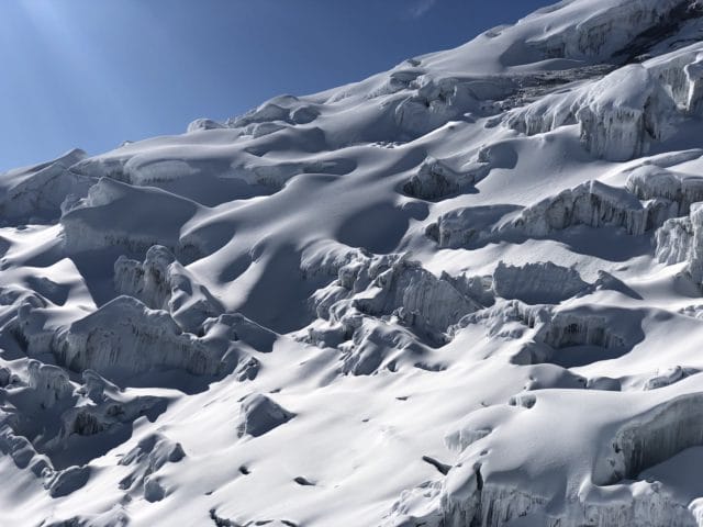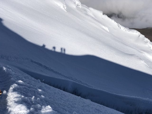 We climbed roped together in groups 2 to 3 to protect in case of falls into a crevasse. There were several but two that were quite large. Both had stable snow bridges that allowed for easy crossing but in some years, ladders are put across the open cracks.