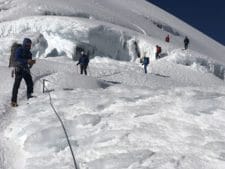 The first couple of hours went well. The climb started on rocky terrain, mostly class 2 with class 3 scrambling on some short sections. I was surprised at the level of rock involved, albeit, quite doable. Soon the terrain somewhat flattened into a sandy loam before intersecting with the glacier. So far, so good. We put on crampons and swapped trekking poles for ice axes. We roped into three teams for safety as the upper part of the mountain has many crevasses, again, not a huge issue as most are easily stepped over and present little danger … but you never know.