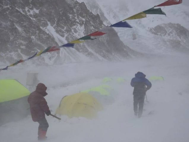 The Kazakhstan, Russia and Kyrgyzstan team have climbed as high as the top of the Black Pyramid – around 7,300-meters/24,000-feet. They have established C1, and C2 with tents and some supplies as well as a fixed rope (that may now be buried) on the Abruzzi route. Next up is to establish their Camps 3 and 4 at 7,300-meters/24,00-feet and 7,800-meters/25,500-feet with food, fuel, stoves, medical oxygen, ropes, and personal gear. The Spanish/Galician team has not climbed above C1 soothes have more work to do. Their strategy seems to be one of swift climbing with less acclimatization – a risky approach – but they have five or more Sherpas who might be able to make this strategy happen.