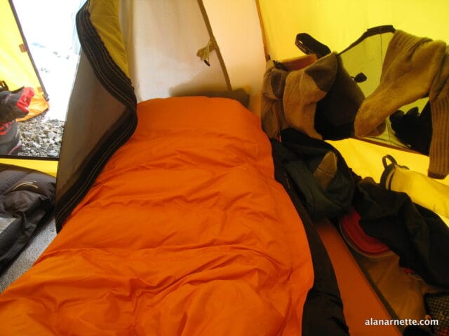 You survey the tent for places to store your collection. The mesh pockets are a great place to hold books, gloves, a few snacks. The mesh sling attached to the ceiling is a great place for your headlamp that will stay at base camp, you have two more for up high. Slowly you find a home for everything and stuff the now almost empty duffle into the back vestibule. Pulling your -20F down sleeping bag out of its stuff sack, you hope it will loft up before you need it tonight.