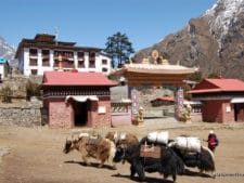 Thinking there was no end to the ever upwards trail, without fanfare, a rock framed entry appeared. On the other side was a stunning flat grassy area, and the Tengboche Monastery stood to their left, yaks quietly grazing on the short grass.