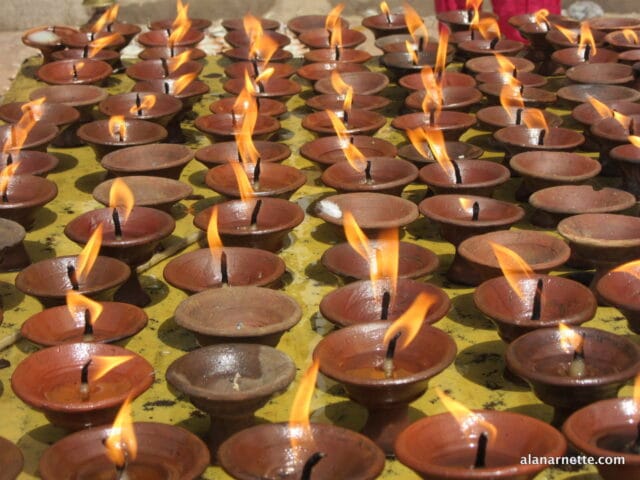 It was quiet for a few moments, and then a young Monk came along who opened the door and quietly welcomed everyone into the Monastery. The first sight was the large Buddha. It was huge and golden. The statue had a peaceful look in his eyes. She noticed the small dark windows that barely let any light inside, that every wall was painted, the large drums sat beside five or six rows of low benches, a pile of robes awaiting their guest. The butter lamps in front of Buddha. A donation box. She intended to make one after prayers.