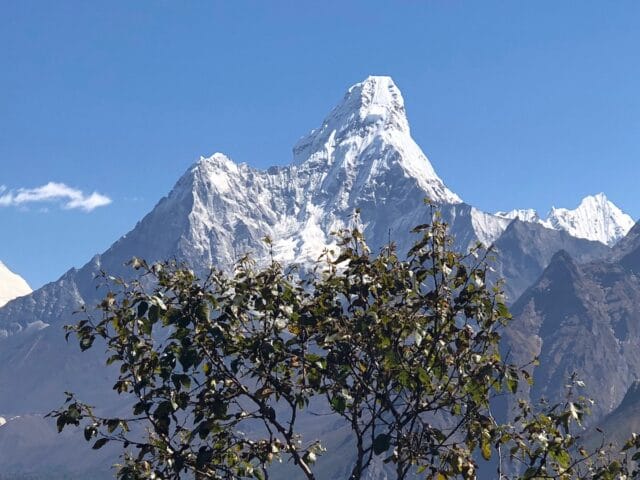 One of the lasting memories they all agreed on was the constant view of Ama Dablam. While not the highest in Sagarmatha National Park, it had to be the most iconic. It seemed to loom over every valley and be in every photo. Most known for the visible snow bulb high on the mountain, the name means “Mother’s Necklace.” The long ridges on each side symbolize a mother’s (Ama) arms protecting her child, and the hanging glacier (Dablam) is similar to a double-pendant containing pictures of the gods, worn by Sherpa women. In any event, the 22,349-foot peak was probably the most photographed mountain thus far for the team.