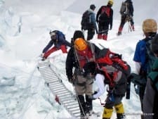 Mingma looked at her as She took a second carabiner off her harness. He went across first. Clipping in ‘biners to the two safety ropes on either side of the ladder, he stepped onto the first rung, then the second and without so much as a pause he was across, standing there staring at her. She could almost hear him in a deep JohnWayne drawl; “OK, kid, I showed you how to do it, now get on with it.”