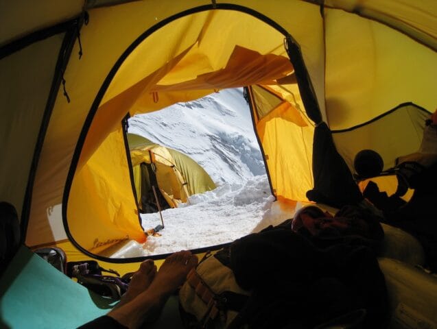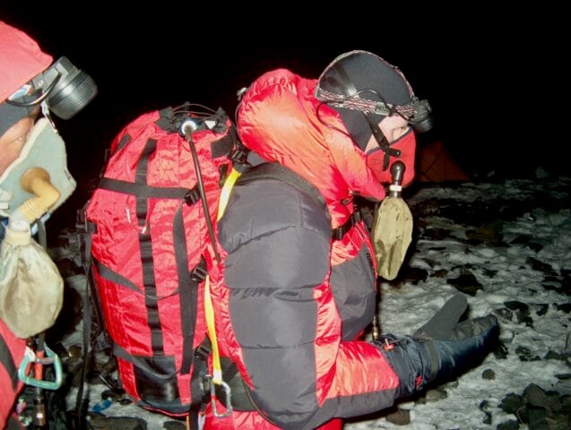 Scooting to the edge of the tent, Snorer pulled in his and Old Man’s large red and yellow,respectively, 8,000-meter Millet and La Sportiva mountaineering boots. Each man took over 15 minutes to pull on the boots; they had kept the liners in their sleeping bags. Liner on first, tie the laces, outers on next, pull the laces tight, and double knot them. Liner gloves were the first layer of protection for their hands; insulated gloves were next and heavy mittens in their packs for back-up. Thankfully the still air temp was not too bad, but when the wind would pick up, all the extra layers would come into play.