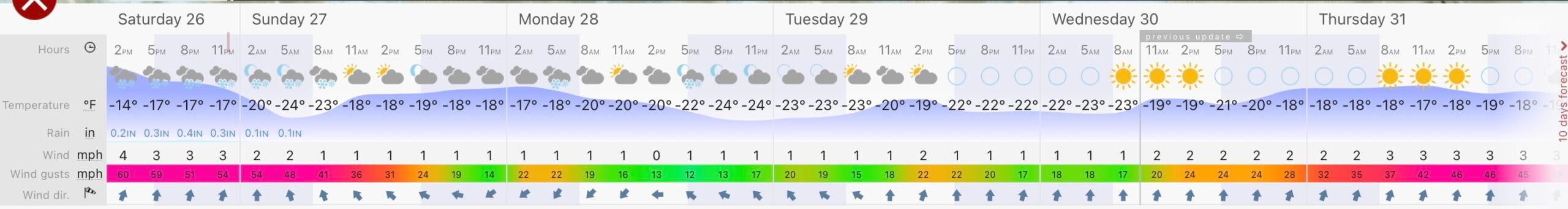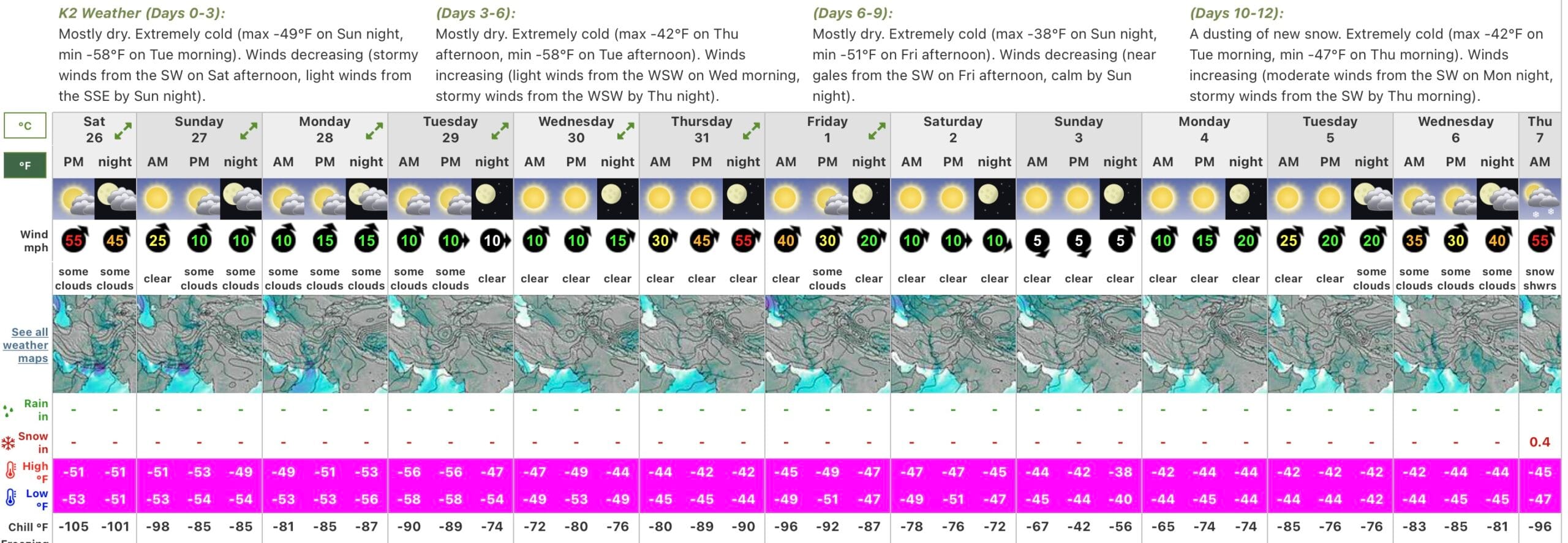 The forecast according to MountainForecast.com calls for mind-numbing cold temps and horrific wind chills approaching -100F. That said, this is usually worse-case with extreme gusts and there appears to be a window starting Sunday, December 27 through Wednesday, December 30 so I expect everyone already at Base Camp to take advantage of this unusual pattern