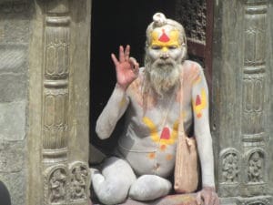 Posing for pictures in the temple area are Sadhus, wandering ascetic yogis, who are trying to acquire liberation from the cycle of death and rebirth by meditating. They are quite eager to pose for tourists in exchange for a small donation.