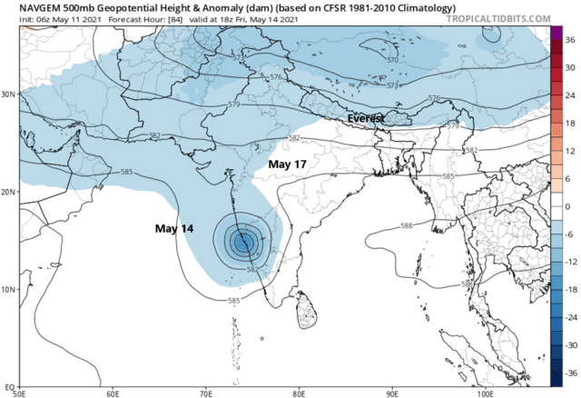 Impacts on Everest?This is the difficult part!The US Navy model (see map below) has this off the west Indian coast on May 14. Then between May 14 to May 17 has this tracking north to northeast and closer to Everest not as cyclone but as a moist area of low pressure. .The concern is by May 18 this could track towards Everest and bring some moderate snowfall.