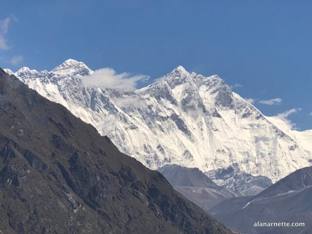 You are fortunate, not a cloud in the sky. So for the first time, you have a crystal clear view of the world’s highest peak, along with the 4th highest, Lhotse. Nuptse, a bit under 8000-meter complete the horseshoe-shaped Western Cwm. You will see all of this much closer in a few weeks. And the ever-present Ama Dablam looms high over the Dudh Kosi. But for now, you enjoy sipping a cappuccino from a bone-china coffee cup on the patio outside the hotel, along with one hundred other gawkers! OK, just one more picture.