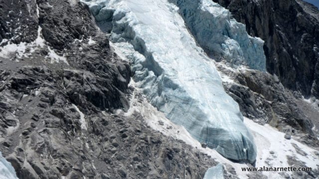 As with all glaciers, the Khumbu moves, as much as 3’/1m a day in the center while barely moving at the edges due to friction against rock walls. The top of the glacier moves faster than the bottom due to friction against the earth. It is this dynamic of fast and slow-moving sections plus the precipitous drop that creates the deep crevasses, some over 150’/45m deep, and towering ice seracs over 30’/9m high.