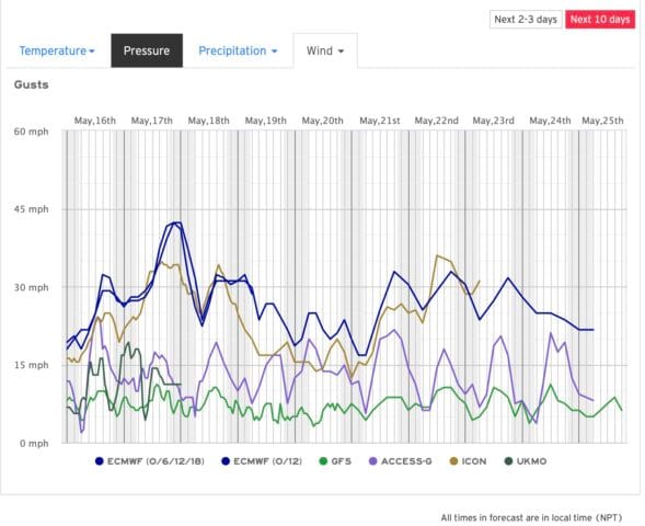 It looks like the winds will stay under 30 mph/50kph through May 25 except for Tuesday, May 17, when they will spike to over 40 mph, along with some snow at midnight, just as the climbers are moving towards the Balcony. That said, other models are showing low winds through the next ten days, so it’s best to check with a human forecaster before heading up.
