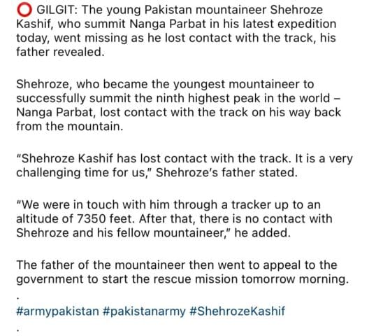 Fazal Ali and Shehroze Kashif are reported missing at 7300m on Nanga Parbat by a post from Kashif’s father on Facebook and on other social media channels. Apparently, a rescue operation has been called for, but there are no details as to any progress as of this post which was around 3:00 am Pakistan time. Update 8:00 am Pakistan time: No rescue efforts have been launched