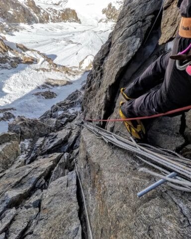 Nanga is a hard and steep mountain. Climbing from C1 to C2 at Nanga Parbat’s Diamir face is certainly the crux of Kinshofer route: first the “Low ice gully” an icy face of max 55 degrees ice and snow, from 4900m to 5900m, and finally the rock face of “Kinshofer wall”, a granite wall of max grade V+ UIAA, 150m long, from 5900m to 6050m. Surely provides interesting and exposed climbing, what with tons of derelict ropes and hardware.