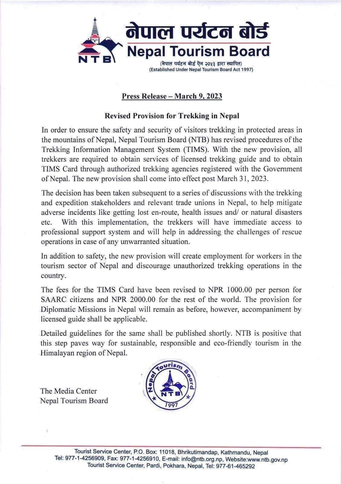 I hoped the Nepal Tourism officials would stop their annual habit of announcing new rules that are never enacted or enforced but not so fast, including banning solo Trekkers. The Nepal Tourism Board Director, director Maniraj Lamichhane , told the media, “This decision has been made for the tourists’ benefit, adding employment will go up significantly thanks to this decision. With this decision, the TIMS permit will no longer be issued to tourists without a guide. They will have to trek via a trekking company.” Oddly the same agency said around 50,000 tourists trekked without a guide or a porter in Nepal in 2019. This is the press release in English: