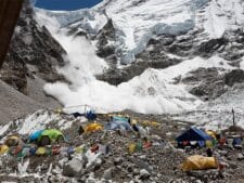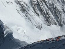 From EBC, you see the Khumbu Icefall, a moving river of glacial ice dropping from the Western Cwm. This is the most challenging section for many climbers. While the Icefall is a dangerous section of the Southeast Ridge, aka South Col route, more people (clients and Sherpas) die elsewhere on the mountain. I used the Himalayan Database and searched for deaths between 5350 and 5940 meters – the altitude range of the Icefall. Of the 220 deaths on the Nepal side, 46 occurred in the Icefall. Virtually all these deaths were Sherpas ferrying loads to camps in the Cwm and above.