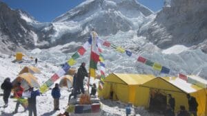 Before a team begins serious climbing, the Sherpa holds a Puja ceremony. This is when a Lama comes to EBC from a local village and prays to the mountain gods for permission to set foot on the peak, forgiveness for hurting the mountains with sharp points like crampons and ice axes, and the safety of the climbers. It’s a solemn event that is executed with a light heart. Several teams have already had their Puja, like Climbing the Seven Summits.
